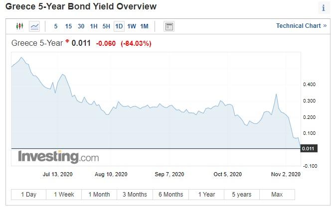 Παράλληλα, η απόδοση του ελληνικού 10ετούς ομολόγου υποχώρησε σε νέο ιστορικό χαμηλό στο 0,734%, ενώ το πενταετές μειώθηκε κοντά στο μηδέν (0,01%) για πρώτη φορά στην ιστορία.