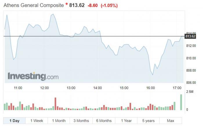 Έτσι οι απώλειες «μαζεύτηκαν» με τον Γενικό Δείκτη να κλείνει τελικά στις 813,62 μονάδες σημειώνοντας πτώση -1,05%.