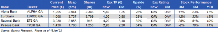 Πιο συγκεκριμένα η νέα τιμή – στόχος για την Alpha Bank είναι στα 1,6 ευρώ (από 1,25 ευρώ πριν), με το περιθώριο ανόδου να διαμορφώνεται στο 28%, για τη Eurobank στα 1,3 ευρώ (από 0,88 ευρώ πριν) με περιθώριο ανόδου 29%, για την Εθνική Τράπεζα στα 4,2 ευρώ (από 3,4 ευρώ πριν) και περιθώριο ανόδου 30% και για την Τράπεζα Πειραιώς παραμένει στα 2,2 ευρώ με περιθώριο ανόδου που φθάνει στο 54%.