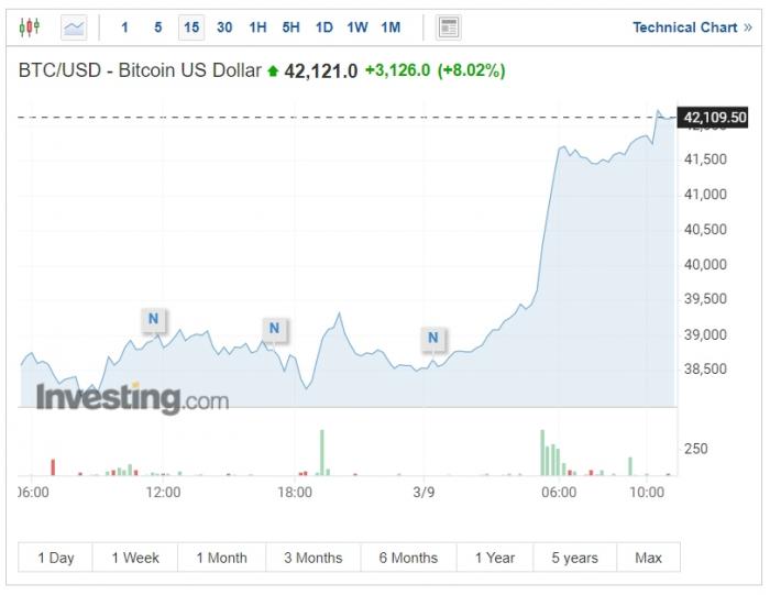 Ισχυρή ανοδική κίνηση για τα κρυπτονομίσματα με το bitcoin να ενισχύεται άνω του 8%, ενώ ενδοσυνεδριακά σημείωσε κέρδη έως και 10%, στα 41,584,21 δολάρια, με τους επενδυτές να αναμένουν το διάγγελμα του Αμερικανού προέδρου, Τζο Μπάιντεν, αναφορικά με την αγορά κρυπτονομισμάτων.