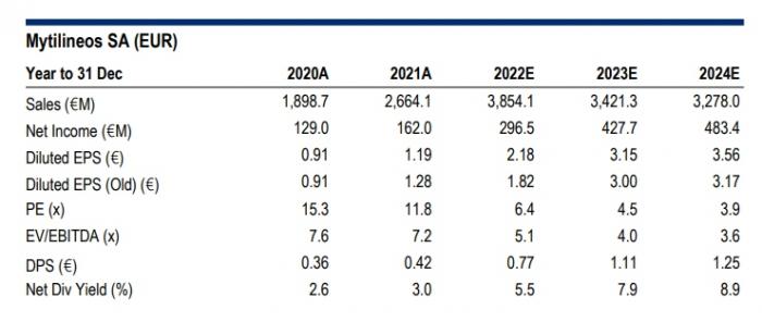 Στην έκθεση σημειώνεται ότι το 2022 θα είναι ένα έτος ισχυρού ρυθμού ενίσχυσης των κερδών για τη Mytilineos, τα οποία εκτιμάται ότι θα διπλασιαστούν σε σύγκριση με το 2020, ενώ η αύξηση του ενεργειακού κόστους για την εταιρεία θα «απορροφηθεί» λόγω της πολύ καλής πορείας της τιμής του αλουμινίου.