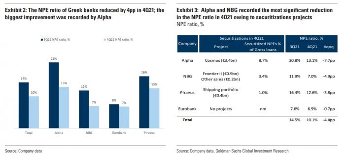 Στο δ’ τρίμηνο του 2021 τη σημαντικότερη μείωση του δείκτη ΝΡΕ πέτυχε η Alpha Bank (κατά 8 μονάδες βάσης) και κατόπιν η Εθνική Τράπεζα (κατά 5 μονάδες βάσης), λόγω της ολοκλήρωσης συγκεκριμένων τιτλοποιήσεων.