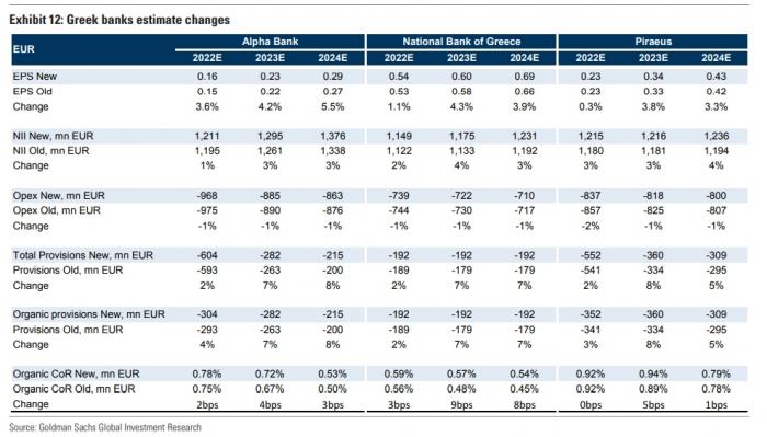 Όπως προαναφέρθηκε η Goldman Sachs προχωρά σε αναβάθμιση από 2% έως 4% των εκτιμήσεών της για τα μεγέθη των ελληνικών τραπεζών στο διάστημα 2022 – 2024. Πιο αναλυτικά προβλέπει τα ακόλουθα: