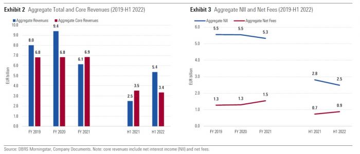 Τα έσοδα διατήρησαν καλή πορεία παρά τις συνεχιζόμενες πιέσεις στα καθαρά έσοδα από τόκους (NII) λόγω της μείωσης του κινδύνου, υποστηριζόμενα από τα καθαρά έσοδα από αμοιβές, συναλλαγές και λοιπά έσοδα. Το πρώτο εξάμηνο του 2022, η ζήτηση πιστώσεων ανέκαμψε αισθητά στον επιχειρηματικό τομέα και αναμένεται ότι η ανάπτυξη θα συνεχιστεί και στο μέλλον, αν και ενδεχομένως θα περιοριστεί από τα υψηλότερα επιτόκια.