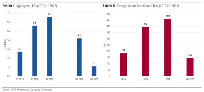 Το πρώτο εξάμηνο του 2022, οι προβλέψεις για επισφάλειες (LLP) μειώθηκαν κατά 74% σε ετήσια βάση, χάρη στη μεγάλη βελτίωση του προφίλ κινδύνου που επιτεύχθηκε πρόσφατα. Ενώ οι ελληνικές τράπεζες θα πρέπει να συνεχίσουν τις περαιτέρω προγραμματισμένες δράσεις μείωσης του κινδύνου, επωφελούμενες επίσης από το Ελληνικό Σύστημα Προστασίας Περιουσιακών Στοιχείων (Hellenic Asset Protection Scheme - HAPS), το οποίο θα παραμείνει σε ισχύ έως τον Οκτώβριο του 2022, εκτιμάται ότι θα υλοποιηθούν πρόσθετες LLPs, καθώς οι πληθωριστικές πιέσεις και οι υψηλότερες τιμές ενέργειας επηρεάζουν το διαθέσιμο εισόδημα των νοικοκυριών και τις δομές κόστους των επιχειρήσεων.