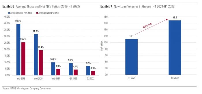 Οι δείκτες ποιότητας του ενεργητικού των ελληνικών τραπεζών συνέχισαν να βελτιώνονται το πρώτο εξάμηνο του 2022, με το μέσο ακαθάριστο και καθαρό δείκτη NPE να μειώνεται σε 7,2% και 3,3% αντίστοιχα στο τέλος Ιουνίου 2022 από 10% και 4,9% στο τέλος του 2021. Η σωρευτική μείωση του αποθέματος των ακαθάριστων NPEs από το τέλος του 2019 έφθασε στο σημαντικό -84% στο τέλος Ιουνίου 2022 και επιτεύχθηκε κυρίως ανόργανα, αξιοποιώντας το σχήμα HAPS για τιτλοποιήσεις NPEs.