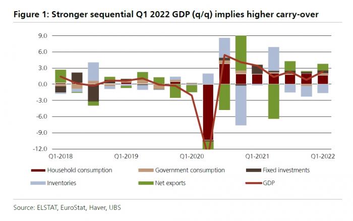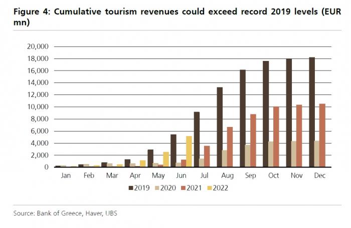 Η διάρθρωση υποδηλώνει υψηλή θετική συνολική συμβολή του τουρισμού, δεδομένου ότι τα έσοδα από τον τουρισμό αυξήθηκαν κατά 330% σε ετήσια βάση το β’ τρίμηνο. Σε συνδυασμό με την αύξηση των φορολογικών εσόδων κατά 31% σε ετήσια βάση το β’ τρίμηνο, αυτό σημαίνει ότι η αύξηση του ΑΕΠ είναι πιθανό να παρέμεινε υγιής το β’ τρίμηνο. Ως εκ τούτου η UBS αναμένει αύξηση του πραγματικού ΑΕΠ κατά 6,6% σε ετήσια βάση το β’ τρίμηνο του 2022. Σημειώνεται ότι τα επίσημα στοιχεία για το ΑΕΠ του β’ τριμήνου θα ανακοινωθούν στις 7 Σεπτεμβρίου.