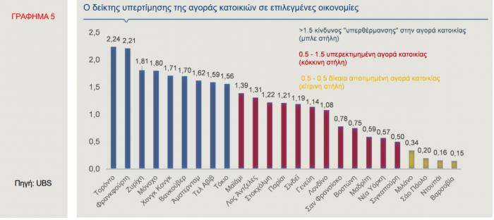 Στο Γράφημα 5 απεικονίζεται ο σύνθετος παγκόσμιος δείκτης του βαθμού υπερτίμησης των ακινήτων της UBS που επιχειρεί να αναδείξει την ένταση αυτών των ανισορροπιών στις μεγαλύτερες πόλεις του κόσμου. Ο δείκτης χρησιμοποιεί τις ακόλουθες τιμές κατάταξης της αγοράς κατοικιών με βάση τον κίνδυνο: ύφεση (βαθμολογία κάτω από -1,5), υποτιμημένη αγορά (-1,5 έως -0,5), δίκαια αποτιμημένη αγορά (-0,5 έως 0,5), υπερτιμημένη αγορά (0,5 έως 1,5) και κίνδυνος φούσκας (άνω του 1,5). Επιπλέον, ο γενικός δείκτης είναι ένας σταθμισμένος μέσος όρος των ακόλουθων πέντε επιμέρους δεικτών: τιμή του ακινήτου προς το εισόδημα, τιμή του ακινήτου προς το ενοίκιο, μεταβολή του λόγου των στεγαστικών δανείων προς το ΑΕΠ, μεταβολή του λόγου κατασκευών προς το ΑΕΠ και σχετική τιμή πόλης-χώρας.