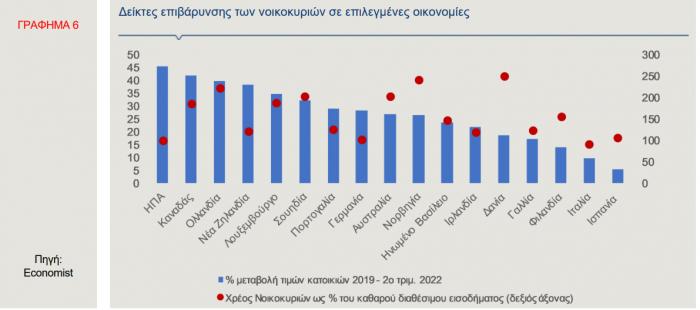 - Πρώτον, από την προηγούμενη αύξηση των τιμών. Οι αγορές κατοικιών, όπου οι τιμές έχουν αυξηθεί μετά την πανδημία, είναι ιδιαίτερα ευάλωτες στη ζήτηση, όπως για παράδειγμα, οι ΗΠΑ και ο Καναδάς (Γράφημα 6, “Housing markets face a brutal squeeze”, Economist, October 2022).