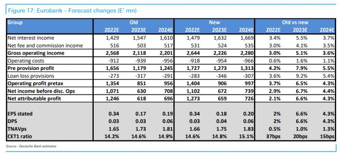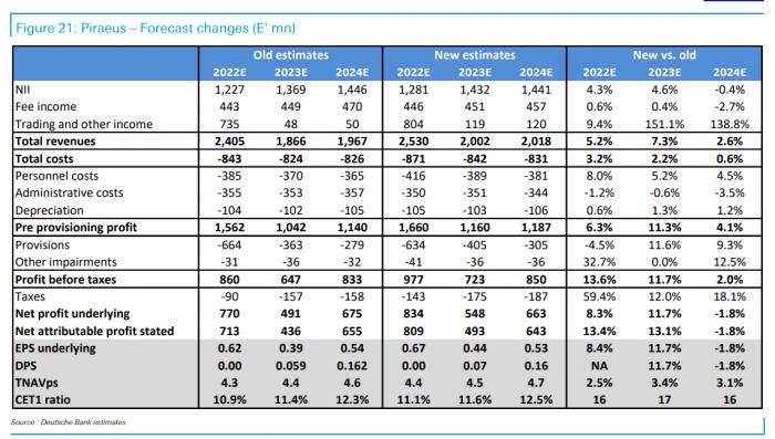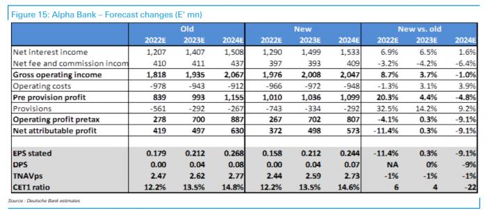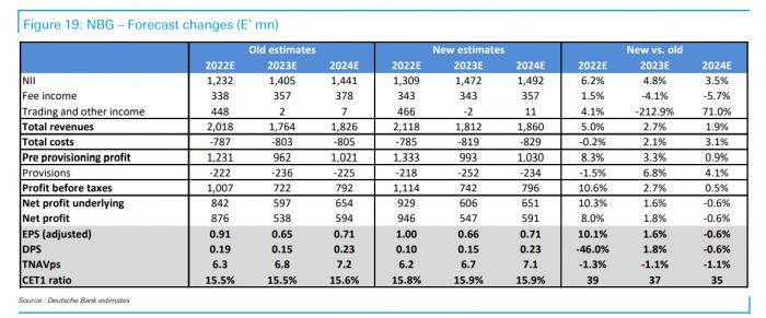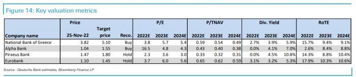Η DB τονίζει ότι το μεγαλύτερο μέρος της διαδικασίας εξυγίανσης των ελληνικών τραπεζών έχει ολοκληρωθεί, με το ποσοστό των ΝΡΕ να είναι, ήδη, μονοψήφιο, ενώ το ενδεχόμενο μικρής αύξησης των προβλέψεων, λόγω του δυσμενούς διεθνούς περιβάλλοντος αλλά και της ενεργειακής κρίσης, θεωρείται απόλυτα διαχειρίσιμο. Προσθέτει ακόμη ότι τα «πισωγυρίσματα» από τον αναβαλόμενο φόρο (DTC) που εξακολουθούν να αποτελούν το μεγαλύτερο μέρος του εγγυημένου κεφαλαίου είναι εντελώς αβάσιμα, αν και αναγνωρίζει ότι το μόνο ζήτημα που θα μπορούσε να προκύψει είναι μια πιθανή επιβάρυνση στο σκέλος των μερισμάτων.