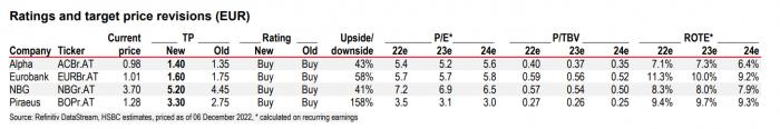 - Eurobank: Η Eurobank ενδέχεται να έχει βραδύτερη αύξηση του βασικού PPI από τους ανταγωνιστές της στο 2023, καθώς οι δραστηριότητές της στη ΝΑ Ευρώπη θα μπορούσαν να οδηγήσουν σε υψηλότερο κόστος καταθέσεων και αύξηση των λειτουργικών εξόδων. Το 10% ROTE της τράπεζας το 2023 εξακολουθεί να είναι πιθανότατα το υψηλότερο μεταξύ των ομότιμων τραπεζών, αν και με μικρότερο περιθώριο, και εκτιμάται ότι το 0,59x P/TBV και 5,7x PE για το 2023 δεν αντικατοπτρίζουν τέτοια κερδοφορία.