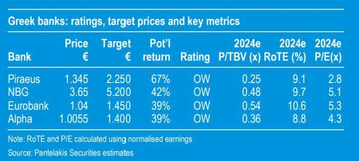 Η ελληνική χρηματιστηριακή τοποθετεί την τιμή - στόχο για την Τράπεζα Πειραιώς στα 2,25 ευρώ, με περιθώριο ανόδου 67% σε σύγκριση με τα τρέχοντα επίπεδα, για την Εθνική Τράπεζα στα 5,20 ευρώ (περιθώριο ανόδου 42%), για τη Eurobank στα 1,45 ευρώ (περιθώριο ανόδου 39%) και για την Alpha Bank στα 1,40 ευρώ (περιθώριο ανόδου 39%) και υπογραμμίζει ότι και εντός του επόμενου έτους θα υπεραποδώσουν σε σύγκριση με τις ευρωπαϊκές.