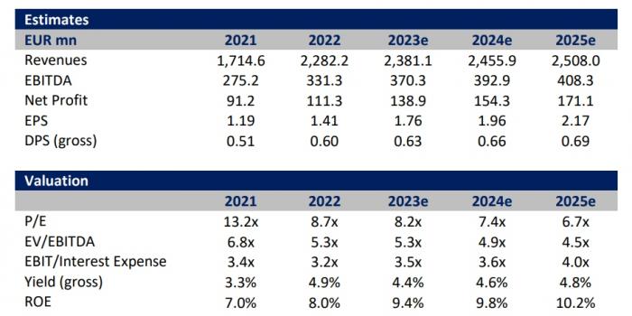 Από την πλευρά του κόστους, τα έξοδα διανομής αναμένεται να μειωθούν, αλλά το κόστος ενέργειας είναι πιθανό να παραμείνει αυξημένο, καθώς αναμένεται ότι η θετική επίδραση από την υποχώρηση των τιμών ηλεκτρικής ενέργειας θα αμβλυνθεί από το νέο συμβολαιοποιημένο τιμολόγιο (που βρίσκεται επί του παρόντος υπό διαπραγμάτευση με τη ΔΕΗ). Συνολικά, προβλέπεται ότι τα λειτουργικά έξοδα/πωλήσεις θα κυμανθούν 10 μονάδες βάσης υψηλότερα σε ετήσια βάση, αλλά με τη θετική λειτουργική μόχλευση να εξακολουθεί να οδηγεί σε 2ψήφια αύξηση των EBITDA σε ετήσια βάση (370 εκατ. ευρώ). Επίσης εκτιμάται ότι η Ελλάδα θα είναι ο κύριος μοχλός ανάπτυξης το 2023 μαζί με τις ΗΠΑ.
