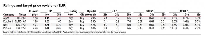 Όπως αναφέρεται στην έκθεση τα έσοδα από τόκους (ΝΙΙ) θα κινηθούν υψηλότερα των προηγούμενων εκτιμήσεων στο α’ τρίμηνο του 2023, γεγονός που μπορεί να ωθήσει υψηλότερα τις αποτιμήσεις. Η ταχεία ανατιμολόγηση των ελληνικών τραπεζικών δανείων, η υποτονική μετακύλιση των καταθέσεων μέχρι στιγμής και η πρόβλεψη των οικονομολόγων της HSBC ότι το βασικό επιτόκιο της ΕΚΤ θα φθάσει στο 3,5%, μεταφράζεται σε αύξηση των εσόδων από τόκους. Παράλληλα προχωρά σε αναβάθμιση κατά 41% των εκτιμήσεων για τα κέρδη του 2023, δηλαδή κατά 11% υψηλότερα σε σύγκριση με τον μέσο όρο των αναλυτών.