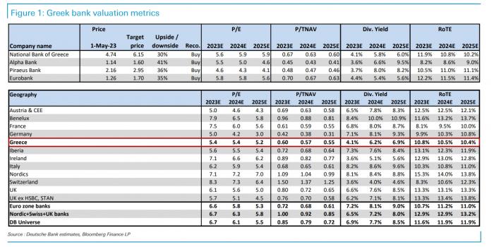 Ο βασικός λόγος υπεραπόδοσης των ελληνικών τραπεζών οφείλεται στην ανάκαμψή τους μετά το «καθάρισμα» των ισολογισμών τους από τα «κόκκινα» δάνεια, ενώ η όλη διαδικασία είναι ταχύτερη απ’ ότι είχαν εκτιμήσει οι αναλυτές της Deutsche Bank, βοηθούμενη από την αύξηση επιτοκίων, που με τη σειρά της οδηγεί σε αναβάθμιση των στόχων των διοικήσεων για τον δείκτη απόδοσης ιδίων κεφαλαίων ROTE, τα οποία, πλέον, είναι στα ίδια επίπεδα με αυτά άλλων τραπεζών της Ν. Ευρώπης.