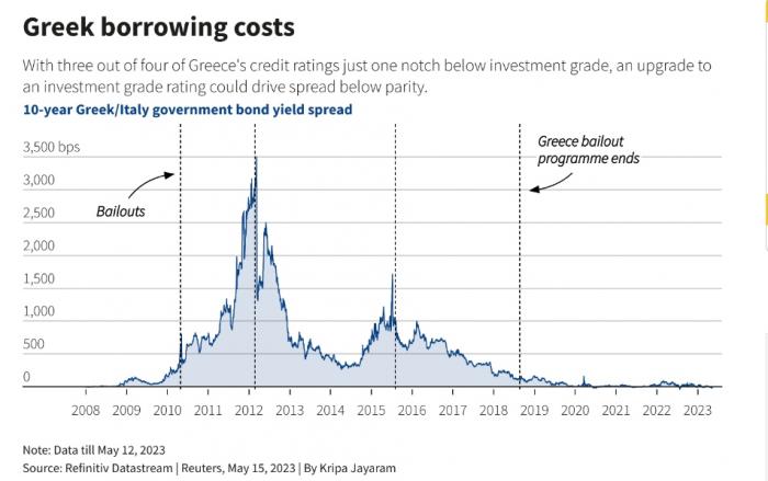 Με τις τρεις από τις τέσσερις αξιολογήσεις της πιστοληπτικής της ικανότητας να βρίσκονται μόλις μία βαθμίδα κάτω από την επενδυτική, οι εκλογές μπορεί να αποτελέσουν το τελευταίο εμπόδιο πριν η Ελλάδα ανακτήσει το καθεστώς που έχασε πριν από μια δεκαετία. Η S&P Global δήλωσε ότι θα μπορούσε να αναβαθμίσει την αξιολόγηση ΒΒ+ της Ελλάδας εντός του επόμενου έτους, εάν μια νέα κυβέρνηση διατηρήσει τη δημοσιονομική πειθαρχία και τον ρυθμό των μεταρρυθμίσεων που θα ξεκλειδώσουν τα κεφάλαια ανάκαμψης της ΕΕ. Η Goldman Sachs λέει ότι το σχέδιο του Κυρ. Μητσοτάκη να τριπλασιάσει περίπου τις δαπάνες των κονδυλίων της ΕΕ φέτος θα μπορούσε να είναι το "τελικό βήμα" για μια αναβάθμιση. Το μακροπρόθεσμο κόστος δανεισμού της Ελλάδας, στο 4% περίπου, είναι ήδη χαμηλότερο από εκείνο της Ιταλίας και μια αξιολόγηση επενδυτικής βαθμίδας θα το οδηγούσε πιθανότατα χαμηλότερα. Αλλά πολλά από τα καλά νέα για την αξιολόγηση της Ελλάδας μπορεί να έχουν ήδη τιμολογηθεί, δήλωσε ο διαχειριστής χαρτοφυλακίου της BlueBay Asset Management, Κάσπαρα Χένσε.