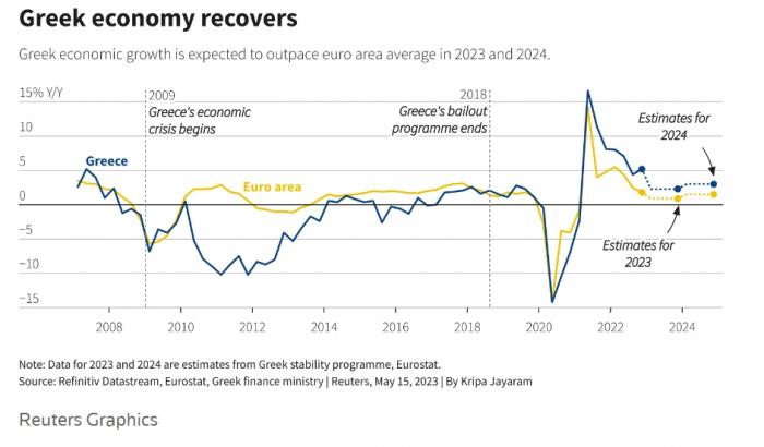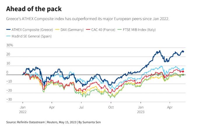 Μια αποφασιστική νίκη οποιουδήποτε κόμματος θα μπορούσε να προσθέσει βραχυπρόθεσμη υπεραπόδοση. Ο Γενικός Δείκτης του ΧΑ έχει σημειώσει άνοδο περίπου 21% μέχρι στιγμής φέτος, ενώ ο ευρωπαϊκός δείκτης STOXX 600 έχει σημειώσει ράλι 10%. Η στροφή του προς τις τράπεζες, που ενισχύεται από την άνοδο των επιτοκίων, συμβάλλει στην εξήγηση της ελληνικής υπεραπόδοσης. Οι επενδυτές θα παρακολουθήσουν τα σχέδια της κυβέρνησης για τη διάθεση των συμμετοχών της στις ελληνικές τράπεζες. Το κρατικό Ταμείο Χρηματοπιστωτικής Σταθερότητας, που ιδρύθηκε κατά τη διάρκεια της κρίσης χρέους, λέει ότι θα αποχωριστεί τις τραπεζικές του συμμετοχές μέχρι το τέλος του 2025. Κατέχει περίπου το 40% της Εθνικής Τράπεζας της Ελλάδος, το 27% της Πειραιώς, το 9% της Alpha Services and Holdings και το 1,4% της Eurobank. «Τα καλά νέα είναι ότι μετά τις εκλογές και την επιστροφή στην επενδυτική βαθμίδα ... θα υπάρξει πολύ μεγαλύτερο ενδιαφέρον και καλύτερες αποτιμήσεις (για τις τράπεζες)», δήλωσε ο Αλ Αλεβιζάκος, διευθύνων σύμβουλος έρευνας της AXIA Ventures Group.