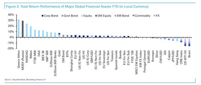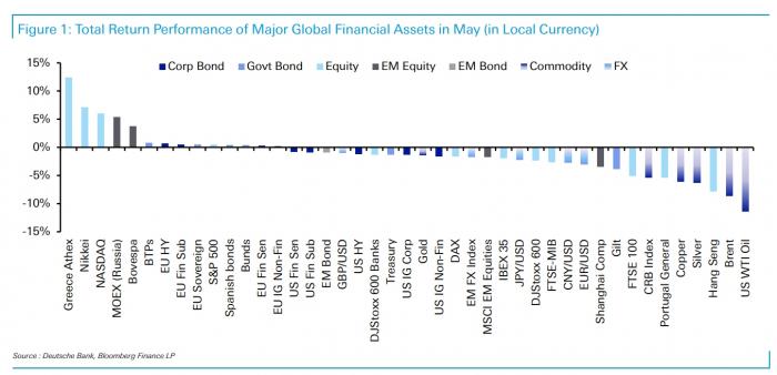 Αντίθετα στους ηττημένους του προηγούμενου μήνα συγκαταλέγονται εμπορεύματα, κρατικά ομόλογα και οι μετοχές στο σύνολό τους. Σύμφωνα με την Deutsche Bank τα εν λόγω assets ακολούθησαν την εξής πορεία: