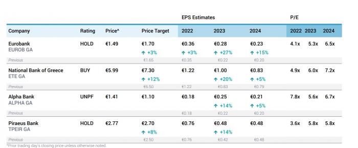 Ο διεθνής όμιλος τοποθετεί την τιμή – στόχο για την Εθνική στα 7,30 ευρώ (από 6,50 ευρώ πριν) με σύσταση «αγορά», για τη Eurobank στα 1,70 ευρώ (από 1,65 ευρώ πριν) με σύσταση «διακράτηση», για την Τρ. Πειραιώς στα 2,70 ευρώ (από 2,50 ευρώ πριν) με σύσταση «διακράτηση», ενώ για την Alpha Bank παραμένει στα 1,10 ευρώ με σύσταση «underperform».