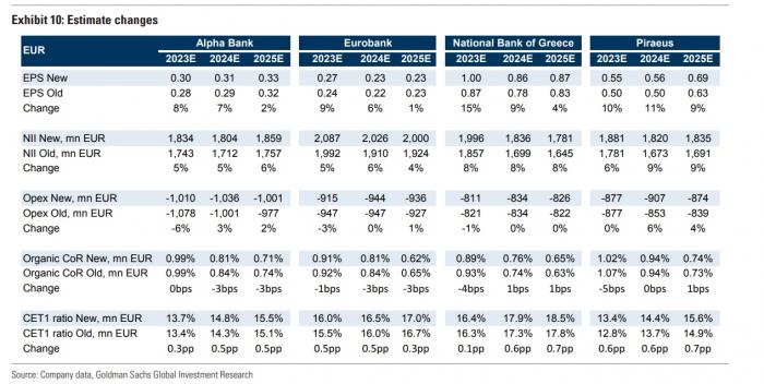 Προχωρά, ακόμη, σε αύξηση των εκτιμήσεων για τα κέρδη ανά μετοχή των ελληνικών τραπεζών κατά περίπου 10%/8%/4% για το διάστημα 2023 - 2025 (κατά μέσο όρο) αντανακλώντας τα αποτελέσματα του 1ου τριμήνου 2023 και τις προοπτικές των επιτοκίων πολιτικής που υποδηλώνει η αγορά, με το επιτόκιο καταθετικής διευκόλυνσης της ΕΚΤ να κορυφώνεται στο 3,75% (σύμφωνα με τους οικονομολόγους της) το 2023, το οποίο είναι περίπου 25 μ.β. υψηλότερο από ό,τι τον Απρίλιο του 2023.