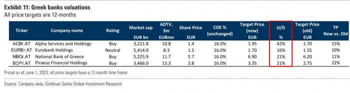 Σε μία ακόμη αναβάθμιση των τιμών στόχων για τις ελληνικές τράπεζες προχωρά η Goldman Sachs σε νέα έκθεση της, υπογραμμίζοντας ότι διατηρεί την εποικοδομητική στάση, όπως τη χαρακτηρίζει, για τον κλάδο και εκτιμώντας ότι θα συνεχίσει την πολύ καλή πορεία που καταγράφηκε στο α’ τρίμηνο του 2023.