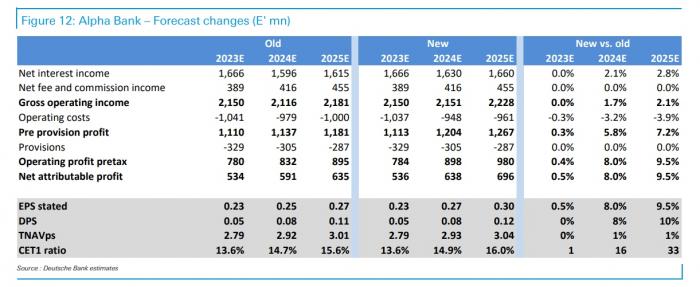 Η Alpha Bank είναι πλέον η κορυφαία επιλογή της Deutsche Bank, η οποία αναβαθμίζει τις εκτιμήσεις για τα κέρδη κατά 8% και 10% περίπου για το 2024 και το 2025, αντίστοιχα, με ασήμαντες αλλαγές για το 2023. Παρά ταύτα, το άνω του 12% της τράπεζας στόχος RoTE για το 2025 (προσαρμοσμένος για τα πλεονάζοντα κεφάλαια μέχρι τον στόχο CET1 13%) εξακολουθεί να είναι λίγο πάνω από τις προβλέψεις της Deutsche Bank (το 10% για το 2023).