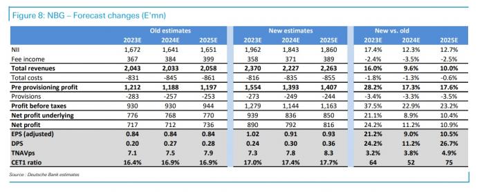 Για την Εθνική Τράπεζα η Deutsche Bank προχωρά σε αναβάθμιση των εκτιμήσεων για τα κέρδη κατά περίπου 24% για το 2023, ενώ το ΝΙΙ θα ενισχυθεί 17% φέτος και πάνω από 12% για το διάστημα 2024 – 25. Εκτιμάται, ακόμη, ότι οι προβλέψεις θα μειωθούν μετά τη θετική πορεία στο α’ τρίμηνο, γεγονός που μπορεί να οδηγήσει σε χαμηλότερο δείκτη CoR. Επιπρόσθετα οι προβλέψεις για τα κεφάλαια είναι επίσης καλύτερες από ό,τι προηγουμένως, φθάνοντας πιθανώς σε επίπεδα που υψηλότερα από τα βέλτιστα, κυρίως ως αποτέλεσμα της οργανικής παραγωγής.