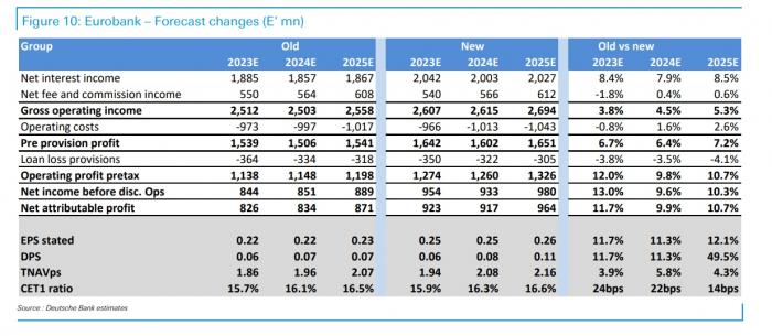 Αναβαθμισμένες είναι οι εκτιμήσεις και για τη Eurobank, καθώς αναμένεται ότι τα κέρδη θα ενισχυθούν κατά περίπου 12%, 10% και 11% για το 2023-25, αντίστοιχα, με σημαντικές αναβαθμίσεις του NII, αποτελεσματικό έλεγχο του κόστους και προβλέψεις οδηγώντας σε αυτές τις βελτιώσεις, που επηρεάζονται επίσης από τις αλλαγές στην παρουσία της εκτός Ελλάδας (η πώληση της Σερβίας και η αγορά στη Βουλγαρία). Αναμένουμε επίσης σημαντικά καλύτερη επίπεδα κεφαλαίου CET1, λόγω της οργανικής δημιουργίας.