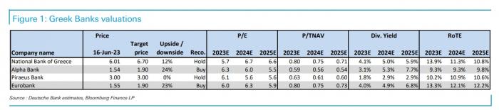 Η «διττή» άποψη της DB για το ελληνικό τραπεζικό σύστημα φαίνεται και στις αλλαγές που πραγματοποιεί τόσο στις τιμές – στόχους όσο και στις συστάσεις. Διατηρεί τη σύσταση «αγορά» για τις μετοχές των Alpha Bank και Eurobank, αυξάνοντας την τιμή – στόχο στα 1,90 ευρώ (από 1,70 ευρώ πριν) και για τις δύο τράπεζες. Σημειώνεται ότι η Alpha Bank είναι πλέον η κορυφαία επιλογή της, κάτι που στο παρελθόν ίσχυε για τον τίτλο της Εθνικής Τράπεζας, καθώς έχει πιο φθηνή αποτίμηση και μεγαλύτερα περιθώρια βελτίωσης. Διατηρεί την τιμή – στόχο για την Τρ. Πειραιώς στα 3 ευρώ αλλά υποβαθμίζει τη σύσταση σε «διακράτηση» («hold») από «αγορά», ενώ αυξάνει την τιμή – στόχο για την Εθνική Τράπεζα στα 6,70 ευρώ (από 6,15 ευρώ πριν) αλλά υποβαθμίζει τη σύσταση σε «διακράτηση» ενώ πριν ήταν «αγορά».
