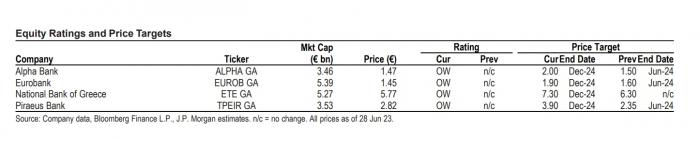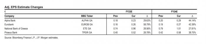 Σταθερά αισιόδοξη για την πορεία των ελληνικών τραπεζών αποδεικνύεται η J.P. Morgan, η οποία σε νέα έκθεσή της προχωρά σε αναβάθμιση τόσο των τιμών – στόχων για τις μετοχές όσο και των εκτιμήσεων για τα κέρδη ανά μετοχή, ενώ διατηρεί αμετάβλητη τη σύσταση «overweight».