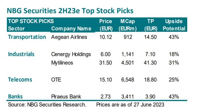 Το θετικό αποτέλεσμα των εκλογών της 25ης Ιουνίου και η επακόλουθη επίτευξη επενδυτικής βαθμίδας παρέχουν αμφότερα την απαραίτητη αφήγηση για θετικές αποδόσεις για τις ελληνικές μετοχές στο 2ο εξάμηνο του 23. Αυτό υποστηρίζεται επίσης από τις ευνοϊκές μακροοικονομικές προοπτικές (αναμένεται αύξηση του ΑΕΠ κατά περίπου 3% σε ετήσια βάση το 2023), οι οποίες στηρίζουν την αύξηση των εταιρικών κερδών και, ως εκ τούτου, τις αποτιμήσεις των ελληνικών μετοχών, οι οποίες παραμένουν ελκυστικές σε πολλούς τομείς. Με αυτό το δεδομένο, μετά το ράλι των ελληνικών μετοχών σε ετήσια βάση (+33%), εκτιμάται ότι οι επενδυτές θα πρέπει να επικεντρωθούν σε μετοχές υψηλής ποιότητας, με πιο ανθεκτικές ταμειακές ροές και κέρδη, κερδοφόρες στρατηγικές και δυνατότητες ανόδου των κερδών κατά συναίνεση.