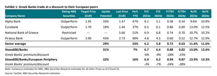 - Τρ. Πειραιώς: Τιμή – στόχος στα 3,90 ευρώ, με περιθώριο ανόδου 43%. Η κορυφαία επιλογή στον τραπεζικό τομέα κυρίως για λόγους αποτίμησης, καθώς προσφέρει ένα πιο ελκυστικό προφίλ απόδοσης-κινδύνου μετά την ισχυρή πρόοδο που έχει σημειώσει στη βελτίωση των βασικών λειτουργικών στοιχείων του ενεργητικού της. Συνολικά, με P/TBV 2023 0,6x, η Πειραιώς συνεχίζει να διαπραγματεύεται με ένα σημαντικό discount σε σχέση με τους ανταγωνιστές της, το οποίο εκτιμάται όμως ότι θα μειωθεί. Η Τράπεζα Πειραιώς παρουσίασε το νέο επιχειρηματικό της σχέδιο για το 2023-25, θέτοντας φιλόδοξους στόχους σε όλα τα μέτωπα. Θεωρείται βέβαιο ότι θα καταφέρει να επιτύχει τους στόχους που έχει θέσει, φέρνοντας την αποτίμησή της πιο κοντά στις ευρωπαϊκές τράπεζες. Εκτιμάται επίσης ότι η κεφαλαιακή επάρκεια της τράπεζας θα παραμείνει σε καλό δρόμο, δεδομένης της θετικής τάσης της κερδοφορίας και της δημιουργίας κεφαλαίων. Η επέκταση του δανειακού χαρτοφυλακίου και οι αυξήσεις των επιτοκίων αποτελούν σημαντικούς «βοηθούς» για την κερδοφορία, η οποία αναμένουμε επίσης ότι θα απορροφήσει το αυξημένο κόστος χρηματοδότησης, ενώ τυχόν αυξημένο κόστος καταθέσεων θα είναι λιγότερο σημαντικό ζήτημα από τους ομολόγους της, δεδομένου του χαμηλότερου δείκτη δανείων/καταθέσεων της Τρ. Πειραιώς. Όσον αφορά τους καταλύτες, το φιλικό προς την αγορά αποτέλεσμα των εκλογών της 25ης Ιουνίου, το οποίο εξαλείφει τους πολιτικούς κινδύνους στην Ελλάδα και διασφαλίζει τη συνέχεια των δημοσιονομικών και οικονομικών πολιτικών, θα πρέπει αναμφίβολα να αποτελέσει θετικό καταλύτη για τις ελληνικές τράπεζες. Η επίτευξη της επενδυτικής βαθμίδας από την Ελλάδα θα αποτελέσει αναμφίβολα έναν ακόμη θετικό καταλύτη για την Τρ. Πειραιώς και την ελληνική αγορά γενικότερα, οδηγώντας ενδεχομένως σε μείωση του κόστους χρηματοδότησής της. Το ίδιο ισχύει και για την αποεπένδυση του ΤΧΣ, αναδεικνύοντας την πλήρη ανάκαμψη των τραπεζών από τα χρόνια της ελληνικής οικονομικής κρίσης, καθώς και την αύξηση της ελεύθερης κυκλοφορίας τους. Τέλος, η διανομή μερίσματος θα λειτουργήσει και ως ένδειξη της επιστροφής της Τράπεζας Πειραιώς στην κανονικότητα μετά τα χρόνια της κρίσης, προσελκύοντας έτσι ακόμη περισσότερο το ενδιαφέρον των επενδυτών.