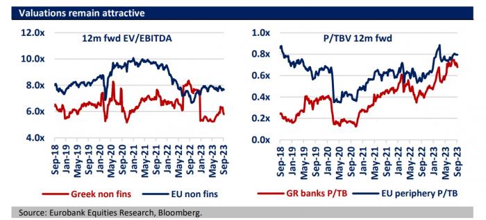 Ενδεικτικά, ο κλάδος των μη χρηματοοικονομικών εξακολουθεί να διαπραγματεύεται με EV/EBITDA για τους επόμενους δώδεκα μήνες σε επίπεδα χαμηλότερα του 6x, στο χαμηλό άκρο του ιστορικού εύρους συναλλαγών και με discount άνω του 20% έναντι των αντίστοιχων στην ΕΕ.