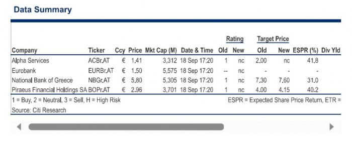 Η νέα τιμή – στόχος για την Εθνική Τράπεζα είναι στα 7,60 ευρώ (από 7,30 ευρώ πριν) και για την Τράπεζα Πειραιώς στα 4,15 ευρώ (από 4 ευρώ πριν), ενώ για την Alpha Bank παραμένει στα 2,20 ευρώ. Σημειώνεται ότι η Citi έχει αναστείλει την αξιολόγηση της Eurobank, ενώ σε προηγούμενη έκθεσή της η τιμή – στόχος που είχε δώσει ήταν στα δύο ευρώ.