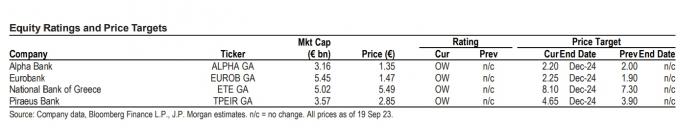 Μία ακόμη αναβάθμιση τιμών – στόχων από την αμερικανική τράπεζα, η οποία διατηρεί τη σύσταση «overweight» και τονίζει ότι οι μέσες εκτιμήσεις των αναλυτών για την ανάπτυξη των ελληνικών τραπεζών είναι πολύ συγκρατημένες. Ως εκ τούτου η J.P.Morgan προχωρά στις ακόλουθες αναβαθμίσεις: