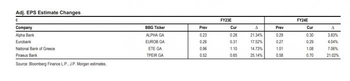 Παράλληλα η αμερικανική τράπεζα προχωρά σε αλλαγές και στις εκτιμήσεις της για τα κέρδη ανά μετοχή των τεσσάρων τραπεζών, με εκτίμηση ότι αυτά θα ενισχυθούν συνολικά κατά 14% εντός του 2023, κατά 6% το 2024 και κατά 1% το 2025.