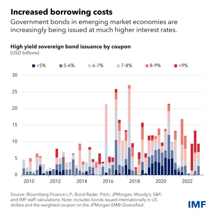Τα υψηλότερα επιτόκια αποτελούν επίσης πρόκληση για τις κυβερνήσεις. Οι χώρες με χαμηλό εισόδημα δυσκολεύονται να δανειστούν σε σκληρά νομίσματα όπως το ευρώ, το γεν, το δολάριο ΗΠΑ και η βρετανική λίρα, καθώς οι ξένοι επενδυτές απαιτούν μεγαλύτερες αποδόσεις. Φέτος, οι εκδόσεις ομολόγων σε σκληρό νόμισμα έγιναν με πολύ υψηλότερα κουπόνια ή επιτόκια. Αλλά οι ανησυχίες για το δημόσιο χρέος δεν αφορούν μόνο τις χώρες με χαμηλό εισόδημα, όπως έδειξε η πρόσφατη άνοδος των μακροπρόθεσμων επιτοκίων στις προηγμένες οικονομίες.