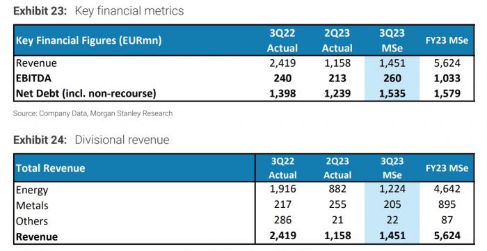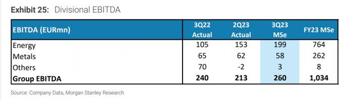 Στα 260 εκατ. ευρώ τοποθετεί τα κέρδη προ φόρων, τόκων και αποσβέσεων (EBITDA) της Mytilineos για το γ’ τρίμηνο η Morgan Stanley, δηλαδή με ετήσια αύξηση 22%, ενώ διατηρεί τη σύσταση «overweight» για τη μετοχή.