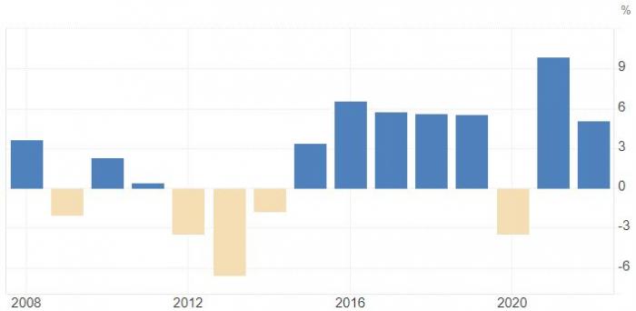 Γράφημα 1: Η ετήσια αυξομείωση του Ακαθάριστου Εθνικού Προϊόντος της Κύπρου τα τελευταία 15 χρόνια (πηγές: Στατιστική Υπηρεσία της Κυπριακής Δημοκρατίας και Tradingeconomics)