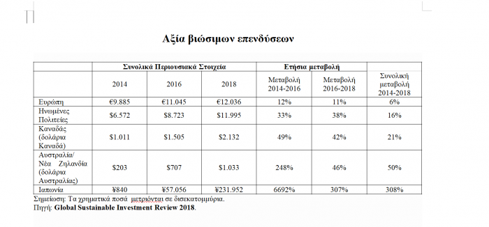 Σύμφωνα με την έκθεση του Global Sustainable Investment Alliance (Global Sustainable Investment Review) για το 2018, τα συνολικά περιουσιακά στοιχεία για βιώσιμες επενδύσεις σε παγκόσμια κλίμακα ανήλθαν περίπου σε 30 τρισεκατομμύρια δολάρια ΗΠΑ, συμπεριλαμβανομένων των πέντε μεγάλων αγορών (σε φθίνουσα σειρά): Ευρώπη, Ηνωμένες Πολιτείες, Ιαπωνία, Καναδάς και Αυστραλία / Νέα Ζηλανδία. Όπως φαίνεται στον πιο κάτω πίνακα, η μεγαλύτερη ανάπτυξη τα τελευταία της περιόδου 2016-2018 σημειώθηκε στην Ιαπωνία, με αύξηση άνω του 300% των υπό βιώσιμη διαχείριση περιουσιακών στοιχείων τους. Ο Καναδάς και η Αυστραλία/Νέα Ζηλανδία αναφέρουν αύξηση άνω του 40%, ενώ ακολουθούν οι ΗΠΑ και η Ευρώπη με 38% και 11% αντίστοιχα.