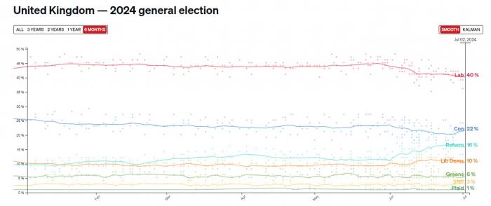 Βάσει των τελευταίων δημοσκοπήσεων, λίγες ώρες πριν από την έναρξη της ψηφοφορίας το Εργατικό Κόμμα εκτιμάται ότι θα κερδίσει 453 έδρες (εκ των 650) και το Συντηρητικό Κόμμα μόλις 115, έχοντας μία από τις μεγαλύτερες ήττες στην ιστορία του.
