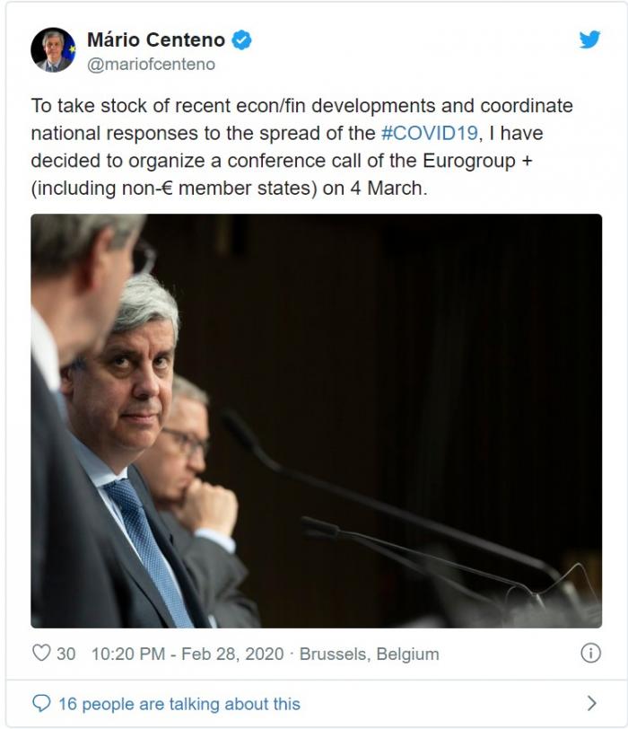 Στην απόφαση να συγκαλέσει έκτακτη συνεδρίαση του Eurogroup με τη διευρυμένη σύνθεση των «27» (δηλαδή και των χωρών που δεν έχουν ευρώ) μέσω τηλεδιάσκεψης στις 4 Μαρτίου προχώρησε ο πρόεδρος του Συμβουλίου, Μάριο Σεντένο.