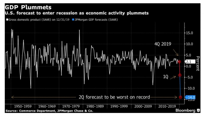 Εν γένει οι αμερικανικοί χρηματοπιστωτικοί όμιλοι εμφανίζονται εξαιρετικά απαισιόδοξοι για την πορεία του αμερικανικού ΑΕΠ με την Bank of American να αναμένει συρρίκνωσή του κοντά στο 25% στο β’ τρίμηνο του 2020, ενώ ελαφρώς πιο καλή είναι η εκτίμηση της JPMorgan Chase η οποία την τοποθετεί στο 14%.