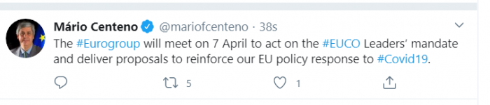 Την πραγματοποίηση ενός νέου έκτακτου Eurogroup, σαφώς μέσω τηλεδιάσκεψης, στις 7 Απριλίου ανήγγειλε μέσω του twitter ο πρόεδρός του Μάριο Σεντένο.