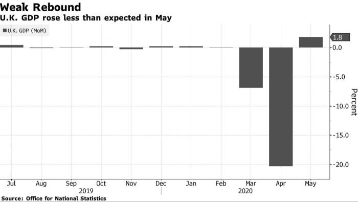 Χαμηλότερη των εκτιμήσεων ήταν η ανάπτυξη της βρετανικής οικονομίας τον Μάιο, έπειτα από την ιστορική συρρίκνωση του Μαΐου. Συγκεκριμένα, το Ακαθάριστο Εγχώριο Προϊόν της Βρετανίας ενισχύθηκε κατά 1,8%, έχοντας μειωθεί κατά 20,3% τον προηγούμενο μήνα και 6,9% τον Μάρτιο, με τους οικονομολόγους να έχουν διαμορφώσει εκτιμήσεις για ανάπτυξη 5,5%.