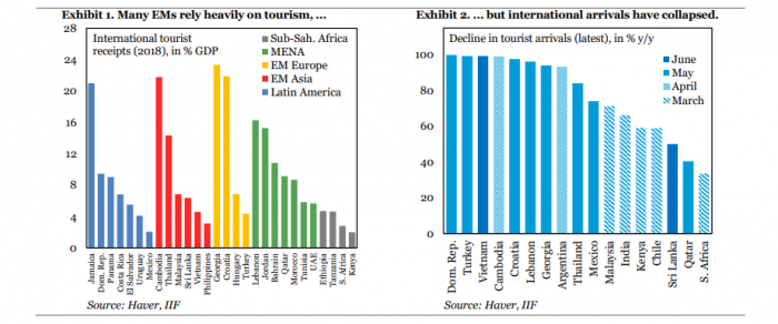 Οι αφίξεις τουριστών μειώθηκαν κατά σχεδόν 100% στη Δομινικανή Δημοκρατία και την Τουρκία τον Μάιο, ενώ το Βιετνάμ εμφάνισε ανάλογη πτώση τον Ιούνιο, σύμφωνα με την έκθεση του IIF. Μικρότερες χώρες όπως η Καμπότζη, η Γεωργία ή η Κροατία δέχθηκαν ανάλογο πλήγμα,. καθώς οι διεθνείς εισπράξεις τουρισμού αντιπροσωπεύουν περισσότερο από το ένα πέμπτο του ΑΕΠ τους. Ενώ πολλές χώρες έχουν αρχίσει να αίρουν το lockdown, η ανάκαμψη του τουρισμού εκτιμάται ότι θα είναι πολύ αργή, με δεδομένο ότι έχουν διατηρηθεί ταξιδιωτικοί περιορισμοί σε 150 χώρες.
