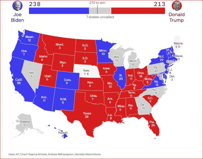 Για την εξασφάλιση της εκλογικής νίκης στις προεδρικές εκλογές των ΗΠΑ απαιτούνται 270 εκλέκτορες. Αναμένονται τα αποτελέσματα της ψηφοφορίας σε 7 πολιτείες, ανάμεσά τους η Πενσιλβάνια, το Μίσιγκαν, το Γουισκόνσιν, η Τζόρτζια και η Βόρεια Καρολίνα.