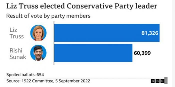 Έπειτα από εβδομάδες αναμέτρησης για την ηγεσία, στην οποία η υπουργός Εξωτερικών ήρθε αντιμέτωπη με τον πρώην υπουργό Οικονομικών Ρίσι Σουνάκ, η Τρας αναδείχθηκε πρώτη σε ψηφοφορία των μελών του Συντηρητικού Κόμματος, κερδίζοντας με 81.326 ψήφους έναντι 60.399 για τον αντίπαλό της.