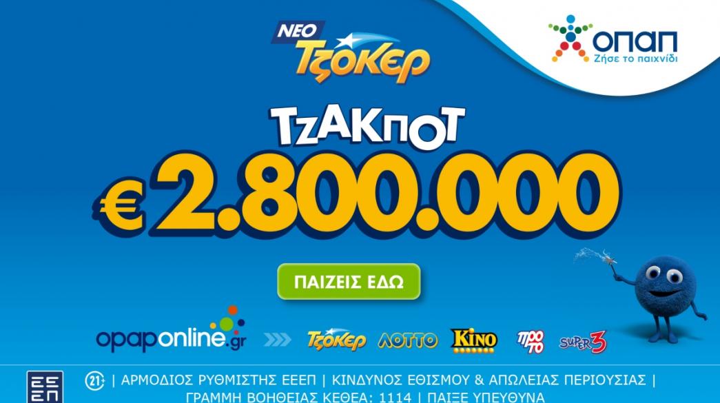 Την ευκαιρία να διεκδικήσουν τουλάχιστον 2.800.000 εκατομμύρια ευρώ έχουν απόψε οι παίκτες του ΤΖΟΚΕΡ. Ταυτόχρονα, με τη συμμετοχή τους στην κλήρωση, όλοι οι παίκτες διεκδικούν στη δεύτερη κατηγορία 100.000 ευρώ.