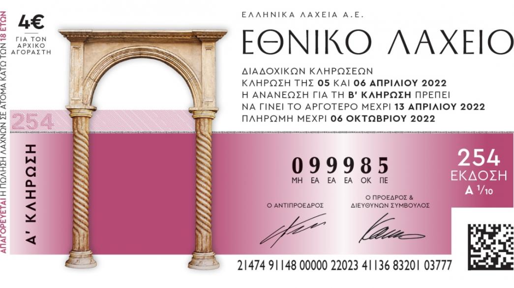 Οι κληρώσεις της 254ης έκδοσης του Εθνικού Λαχείου θα αρχίσουν στις 5 Απριλίου και θα ολοκληρωθούν στις 27 Μαΐου 2022. Αναλυτικά, το πρόγραμμα κληρώσεων του παιχνιδιού έχει ως εξής: